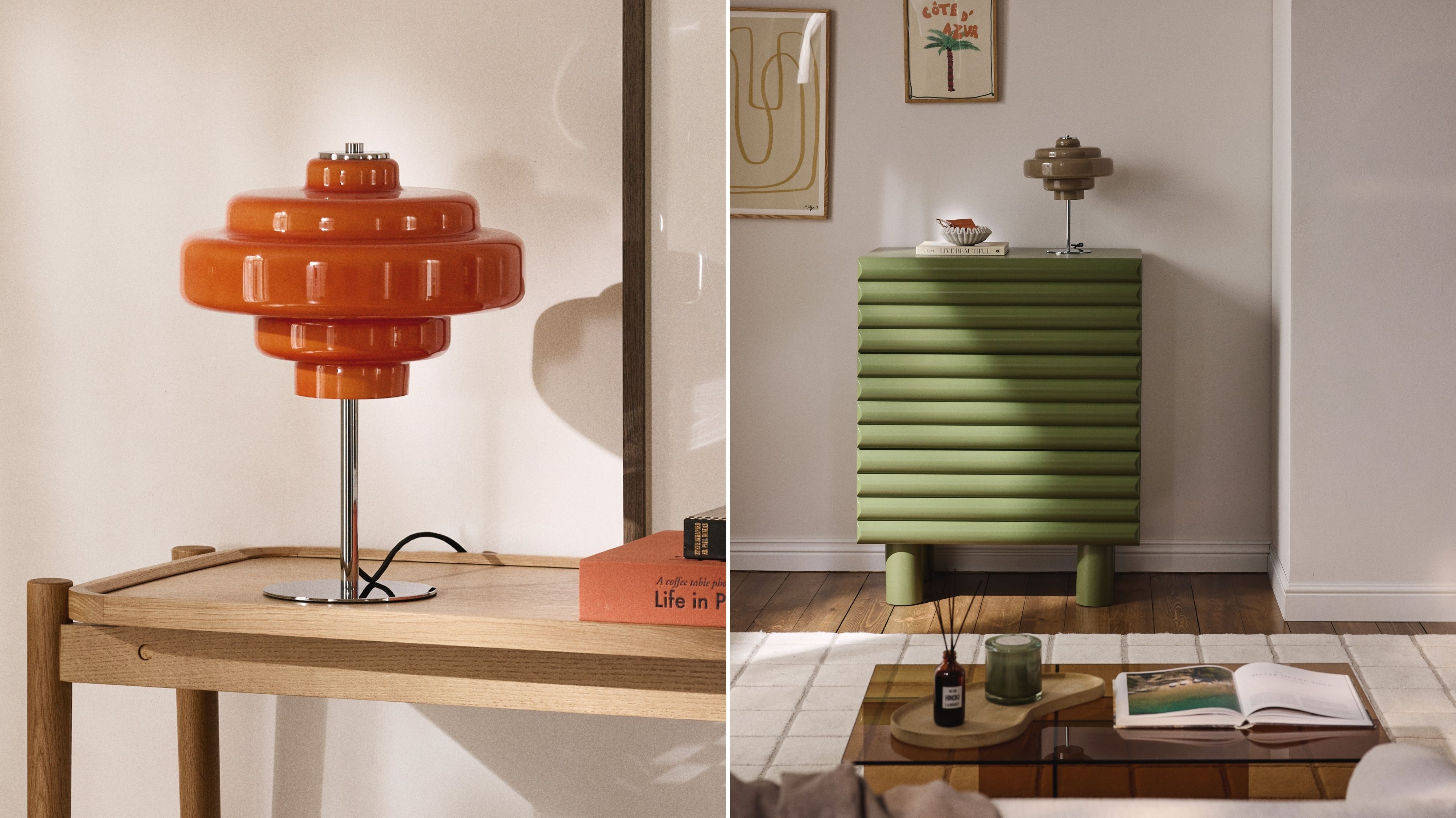 Inspired by the bold shapes and warm tones of the 70s, Millie brings a touch of retro charm to modern interiors. The coloured glass shade – available in vibrant orange or soft taupe – bathes the light in a gentle, glowing atmosphere. Paired with cool chrome, the design feels playful, elegant, and timeless.